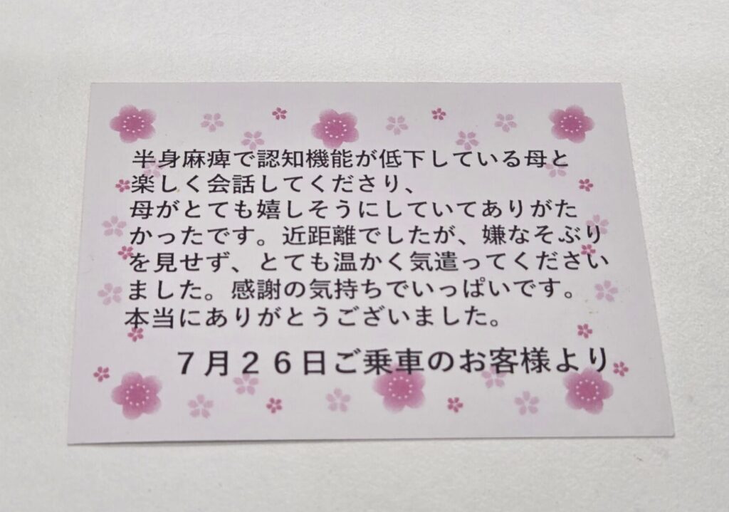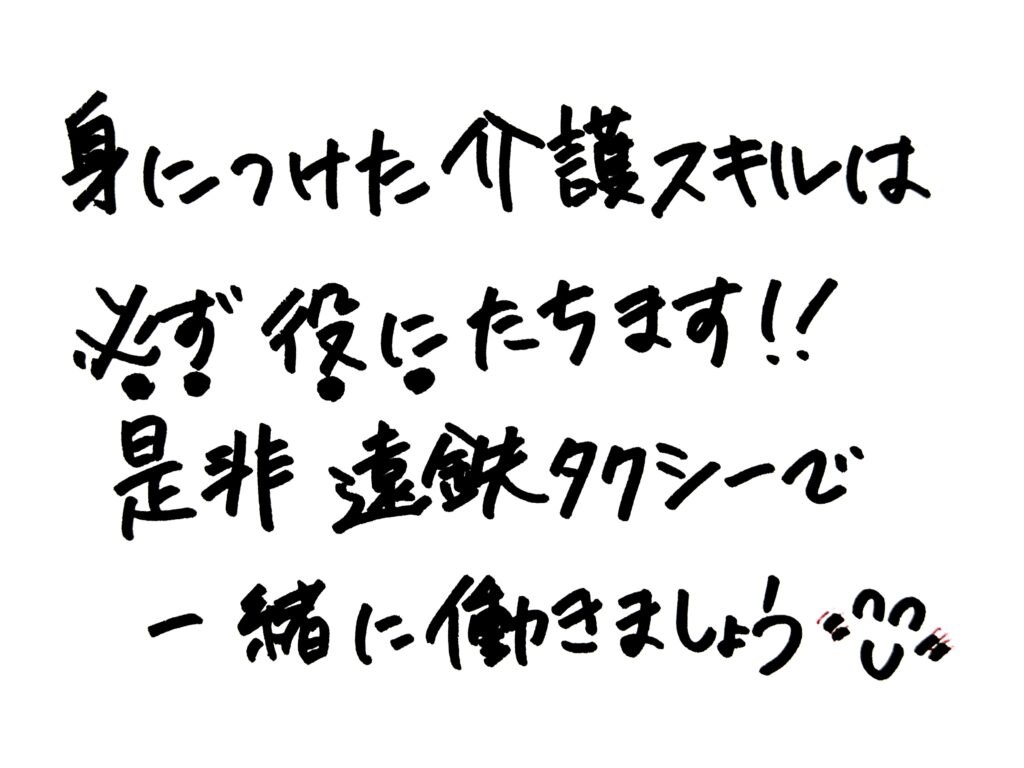 また、乗り降りの際のお声掛けについても、介護現場での経験があるため、お客様の状況に合わせて適切な声掛けやサポートができていると思います。