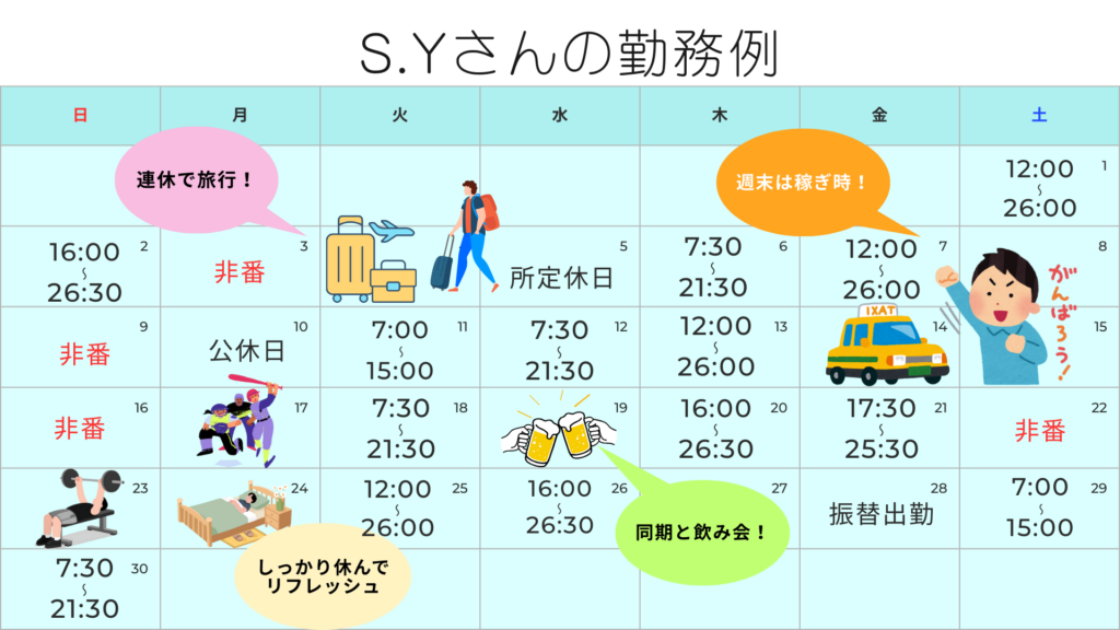 遠鉄タクシーでは「4勤2休」「日勤」「夜勤」など、ライフスタイルに合わせて勤務時間をある程度調整できます。その中でも、プライベートの時間を大事にしながらしっかり稼ぎたい社員は、4勤2休で働いています。