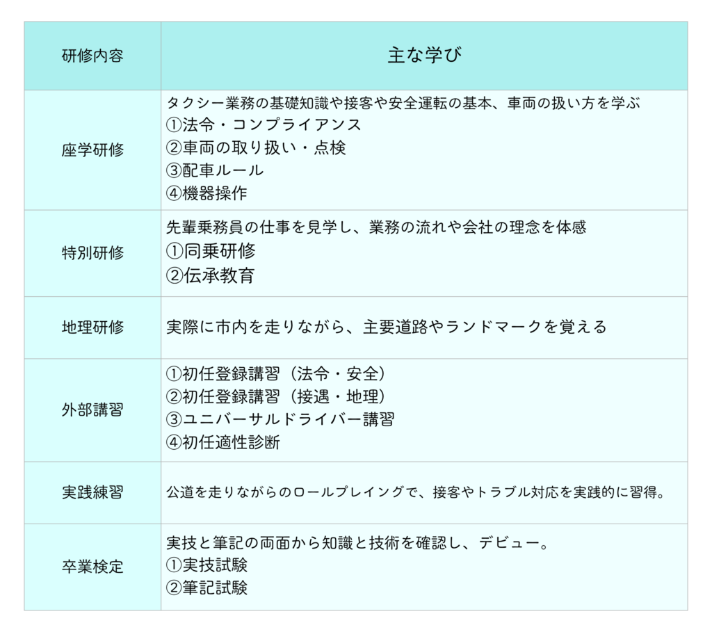 入社後は、まず座学で接客マナーや安全運転の心得を学んだのち、特別研修や地理研修、外部講習を通じて、業務に必要な知識やスキルを身につけます。