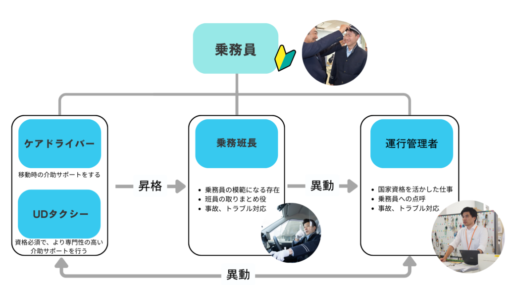 遠鉄タクシーでは、一般タクシー乗務員として経験を積んだ後、ケアドライバーやUDタクシー乗務員など、より専門性の高い業務へステップアップしていくことができます。資格取得支援制度や講師育成の機会もあり、中途入社であってもキャリアの幅を広げやすい環境が整っています。