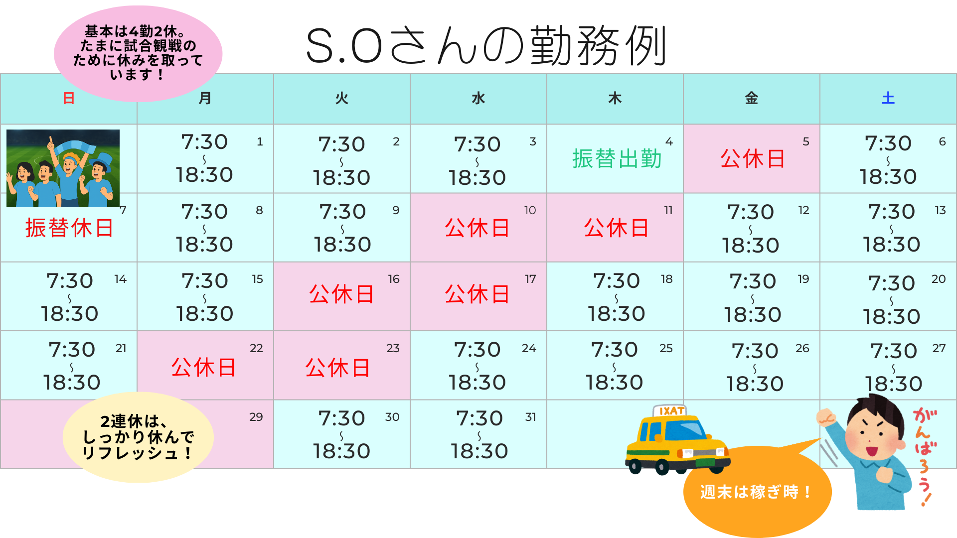 S・Oさんは現在日勤の4勤2休で勤務しており、毎回7:30頃に出勤し、18:30頃に退勤する安定したリズムで働いています。